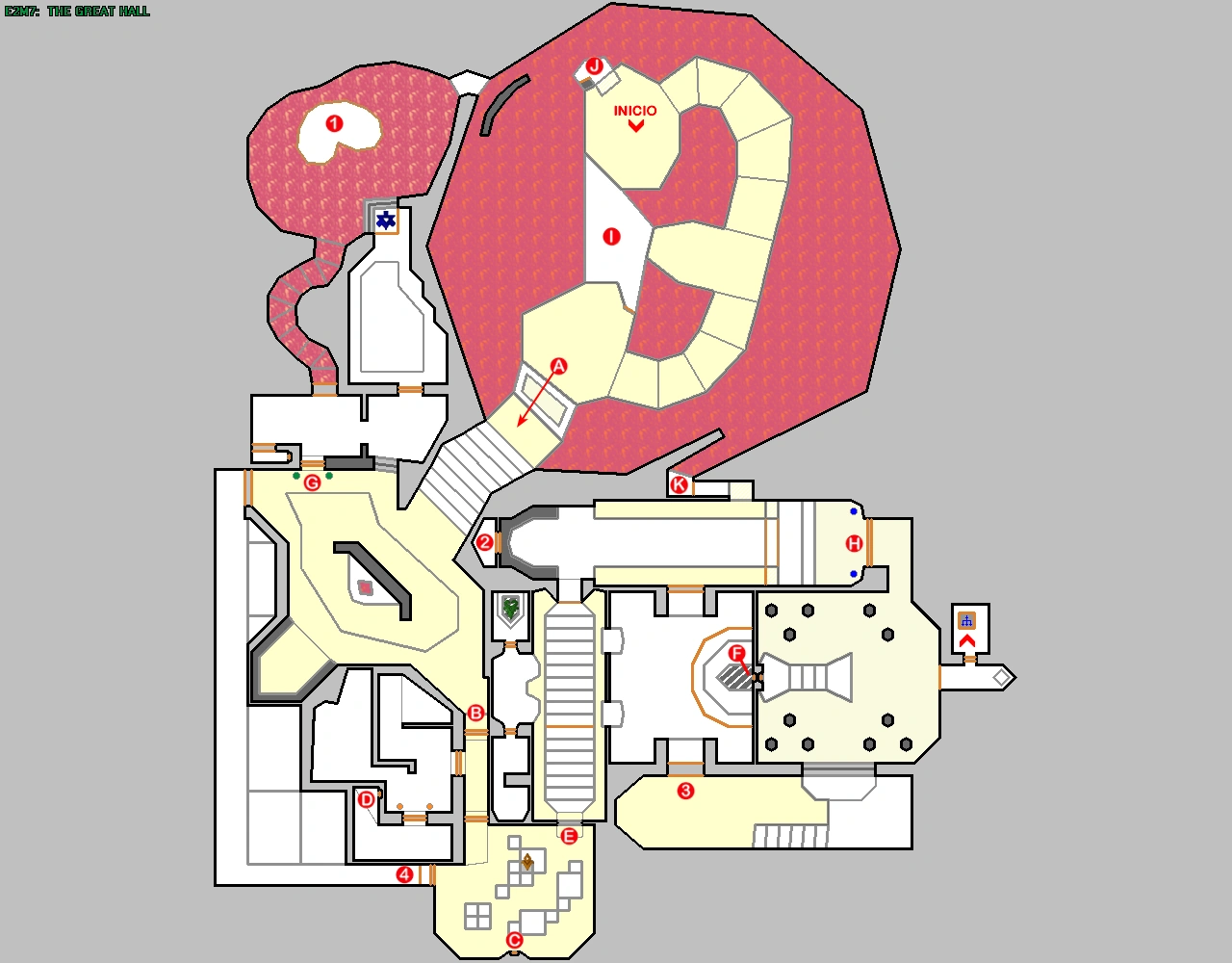 Ahora puedes volver a la sala alargada con la escalera central y bajar por ella hasta otra sala transversal, que tiene la puerta azul (H) al fondo por el lado derecho. Detrás de la puerta azul hay una sala con columnas rojas y una escalera azul que lleva a un interruptor: éste abre la pared detrás que lleva a una Urna mística y al cuarto de salida, custodiado por otro Discípulo.