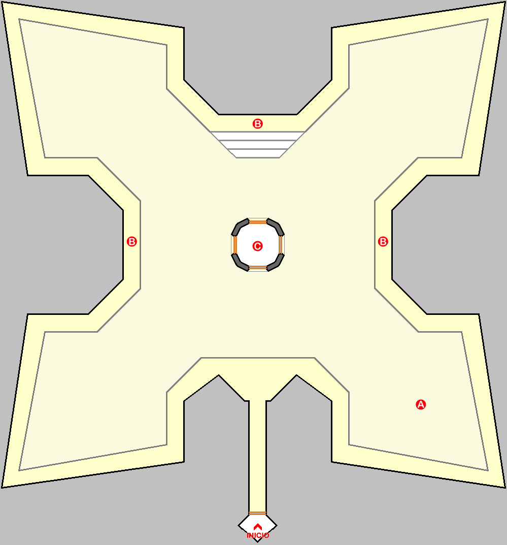 Casi toda la munición disponible está sobre la pasarela elevada (B) por encima de la arena principal, que contiene cohetes individuales y algunas celdas de energía, a excepción de un Fusil de plasma que se encuentra en una pequeña sala en el centro de la arena (C). La única forma de volver a subir a la pasarela es por una amplia escalinata que se encuentra al norte del edificio central.
