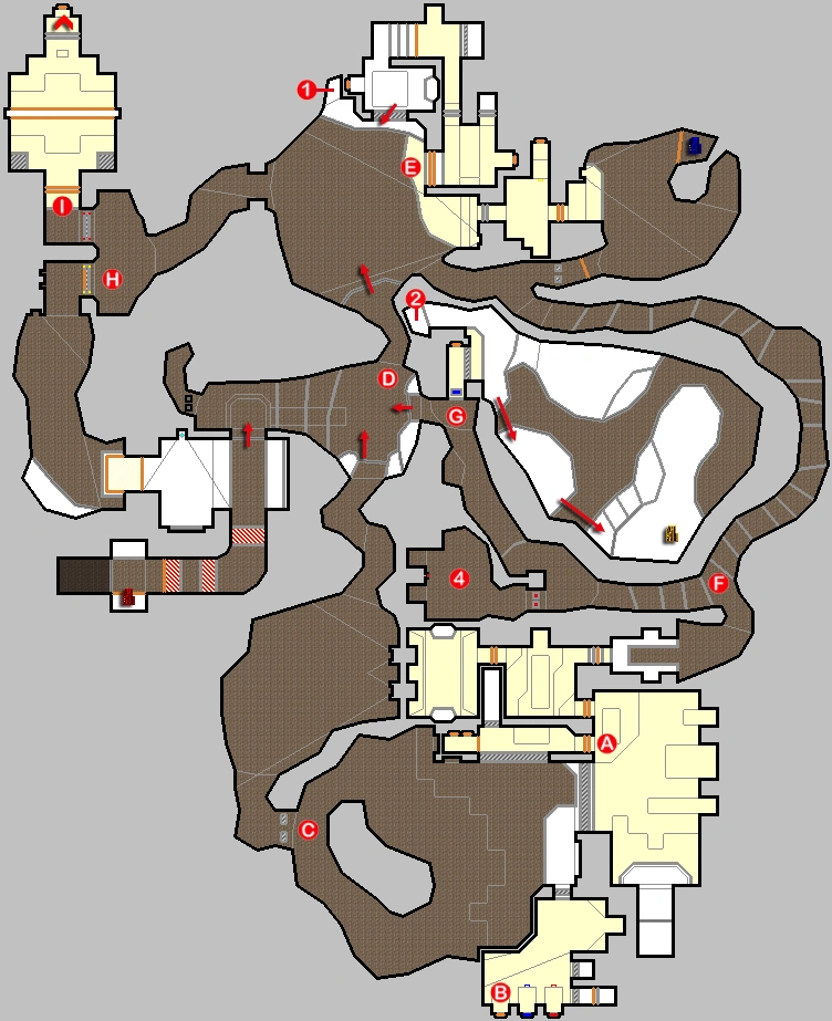 Cuando sales del pasillo de hierro, dobla a la derecha y salta abajo a un lugar por donde ya pasaste. Usa de nuevo el túnel (D) hacia el norte para volver al área de la llave azul. Ingresa en el edificio por la puerta pequeña y pulsa el interruptor con las marcas amarillas. Luego vuelve afuera y toma por el pasaje hacia el oeste hasta encontrar una puerta con marcas rojas cerrada y otra puerta (G) que acabas de abrir con el interruptor amarillo.