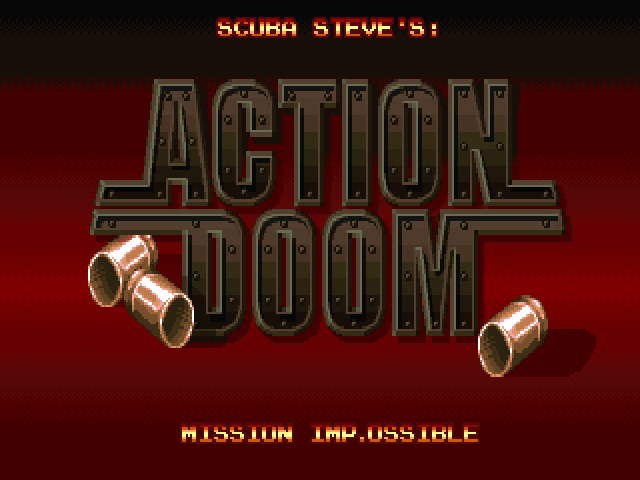 Action Doom, also lesser known by it's full title, Action Doom Mission Imp.ossible is a total conversion that attempts to simulate 2D sidescroller shoot-em-up gameplay in Doom's first person perspective. The project was spearheaded by Stephen "Scuba Steve" Browning with additional help from Mike "Cyb" Watson, Julian Aubourg, and Kara "Nanami" Rader. The author of Action Doom dedicated a significant portion of time to creating blogged "advertisements" and held contests for various events to give away prizes that related to Action Doom.