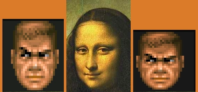 Comparison of Mona Lisa and the Doomguy. The image on the left is corrected; the one on the right is not.