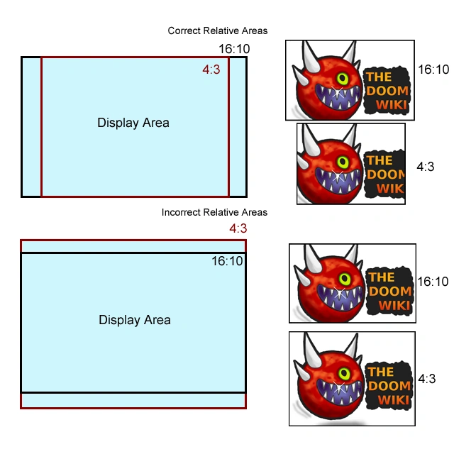 Some source ports include aspect ratio correction. This performs stretching of the logical frame buffers's contents when running in a 4:3 screen mode, so that the graphics appear as they appeared in Vanilla Doom. This is generally accomplished in one of two ways: