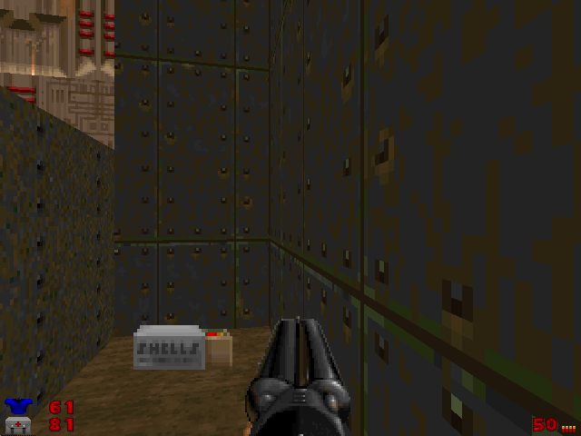 A box of shotgun shells sits behind the stairway in the first room of Level 3: The Gantlet, in Doom II.