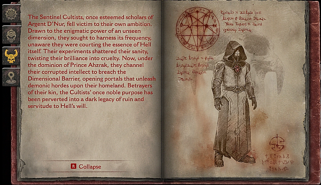The Sentinel Cultists, once esteemed scholars of Argent D'Nur, fell victim to their own ambition. Drawn to the enigmatic power of an unseen dimension, they sought to harness its frequency, unaware they were courting the essence of Hell itself. Their experiments shattered their sanity, twisting their brilliance into cruelty. Now under the dominion of Prince Ahzrak, they channel their corrupted intellect to breach the dimensional barrier, opening portals that unleash demonic hordes upon their homeland. Betrayers of their kin, the Cultists' once noble purpose has been perverted into a dark legacy of ruin and servitude to hell's will.