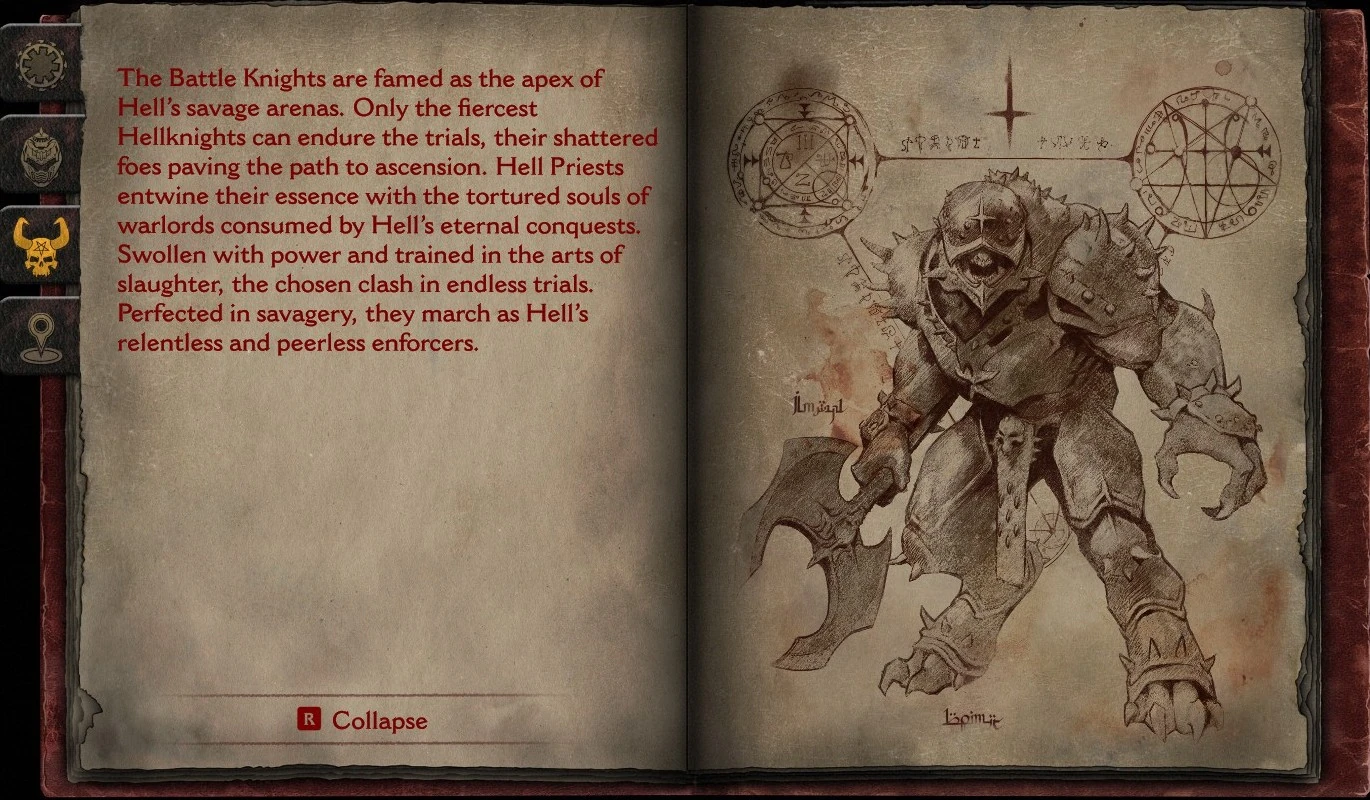 The Battle Knights are famed as the apex of Hell's savage arenas. Only the fiercest Hellknights can endure the trials, their shattered foes paving the path to ascension. Hell Priests entwine their essence with the tortured souls of warlords consumed by Hell's eternal conquests. Swollen with power and trained in the arts of slaughter, the chosen clash in endless trials. Perfected in savagery, they march as Hell's relentless and peerless enforcers.