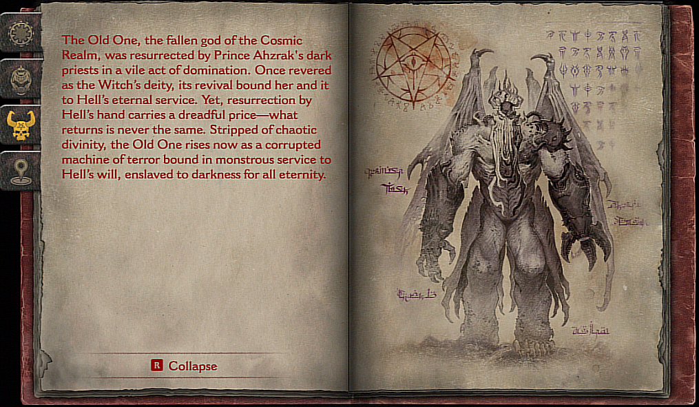 The Old One, the fallen god of the Cosmic Realm, was resurrected by Prince Ahzrak's dark priests in a vile act of domination. Once revered as the Witch's deity, its revival bound her and it to Hell's eternal service. Yet, resurrection by Hell's hand carries a dreadful price -- what returns is never the same. Stripped of the chaotic divinity, the Old One rises now as a corrupted machine of terror bound in monstrous service to Hell's will, enslaved to darkness for all eternity.