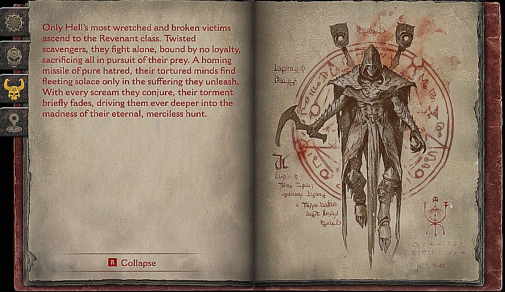 Only Hell's most wretched and broken victims ascend to the Revenant class. Twisted scavengers, they fight alone, bound to no loyalty, sacrificing all in the pursuit of their prey. A homing missile of pure hatred, their tortured minds find fleeting solace only in the suffering they unleash. With every scream they conjure, their torment briefly fades, driving them even deeper into the madness of their eternal, merciless hunt.