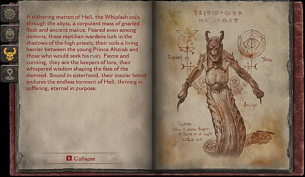 A slithering matron of Hell, the Whiplash coils through the abyss, a corpulent mass of gnarled flesh and ancient malice. Feared even among demons, these reptilian wardens lurk in the shadows of high priests, their coils a living barrier between the young Prince Ahzrak and those that would seek his ruin. Fierce and cunning, they are keepers of lore, their whispered wisdom shaping the fate of the damned. Bound in sisterhood, their insular brood endures the endless torment of Hell, thriving in suffering, eternal in purpose.