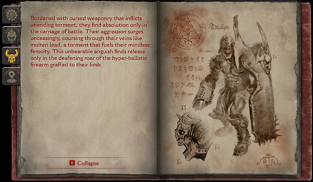 Burdened with cursed weaponry that inflicts unending torment, they find absolution only in the carnage of battle. Their aggression surges unceasingly, coursing through their veins like molten lead, a torment that fuels their mindless ferocity. This unbearable anguish finds release only in the deafening roar of the hyper-ballistic firearm grafted to their limb.