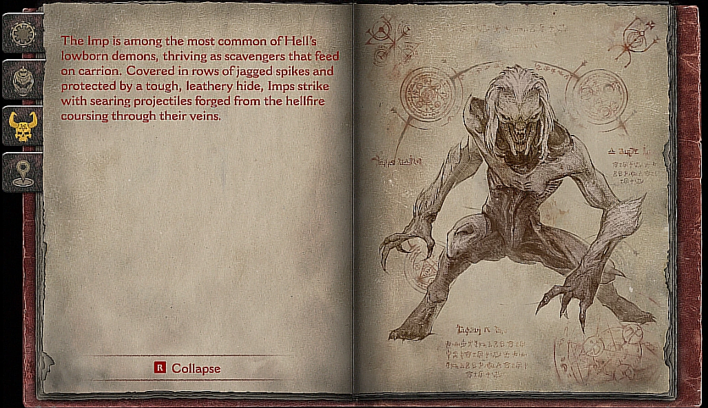 The Imp is among the most common of Hell's lowborn demons, thriving as scavengers that feed on carrion. Covered in rows of jagged spikes and protected by a tough, leathery hide, Imps strike with searing projectiles forged from the hellfire coursing through their veins.