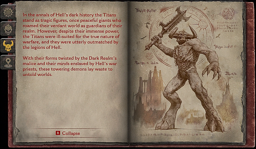 In the annals of Hell's dark history the Titans stand as tragic figures, once peaceful giants who roamed the verdant world as guardians of their realm. However despite their immense power, the Titans were ill-suited for the true nature of warfare, and they were utterly outmatched by the legions of Hell.