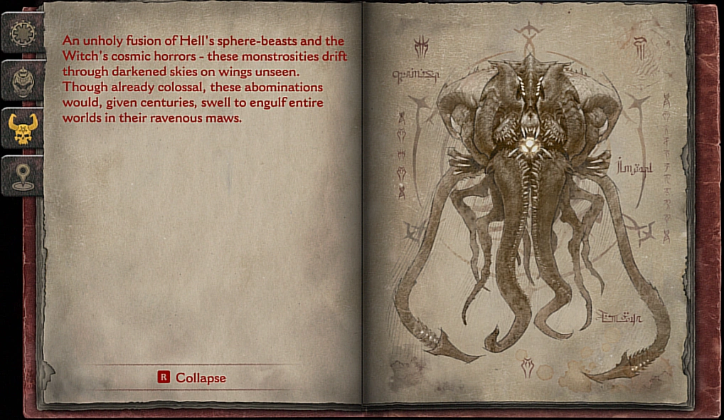 An unholy fusion of Hell's sphere-beasts and the Witch's cosmic horrors - these monstrosities drift through the darkened skies on wings unseen. Though already colossal, these abominations would, given centuries, swell to engulf entire worlds in their ravenous maws.