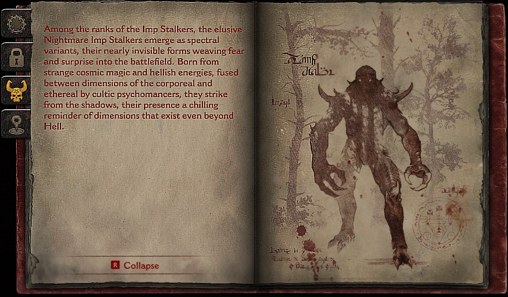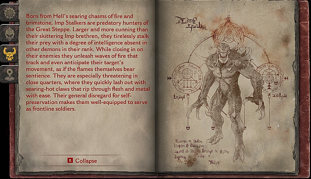 Born from Hell's searing chasm of fire and brimstone, Imp Stalkers are predatory hunters of the Great Steppe. Larger and more cunning than their skittering Imp brethren, they tirelessly stalk their prey with a degree of intelligence absent in other demons in their rank. While closing in on their enemies they unleash waves of fire that track and even anticipate their target's movement, They are especially threatening in close quarters where they quickly lash out with searing-hot claws that rip through flesh and metal with ease. Their general disregard for self-preservation makes them well-equipped to serve as frontline soldiers.