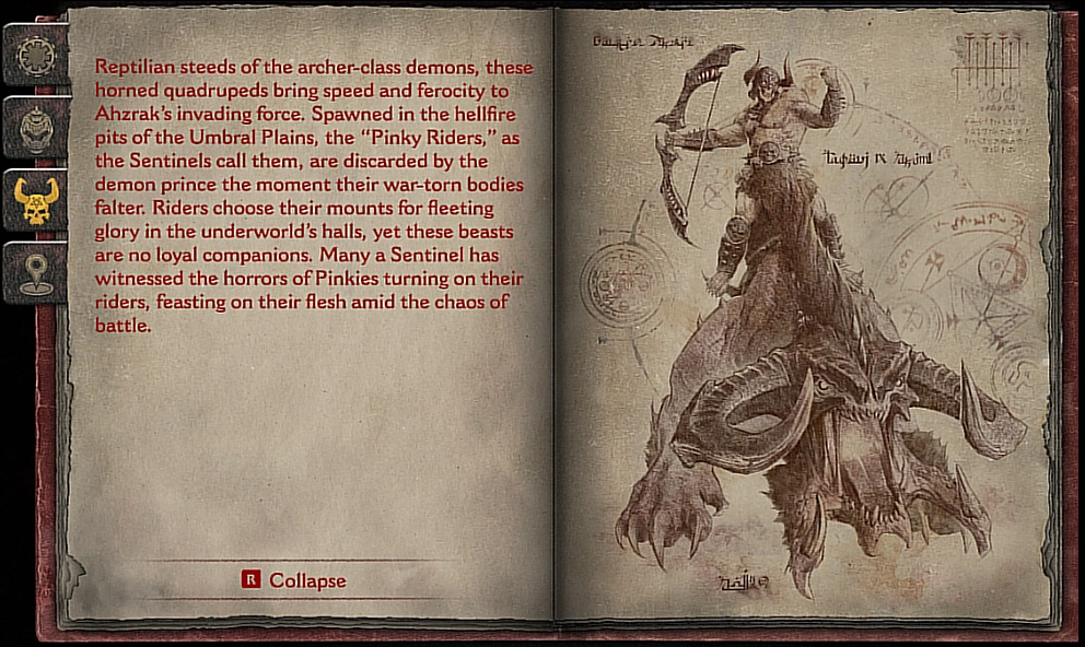Reptilian steeds of the archer-class demons, these horned quadrupeds bring speed and ferocity to Ahzrak's invading force. Spawned in the hellfire pits of the Umbral Plains, the "Pinky Riders," as the Sentinels call them, are discarded by the demon prince the moment their war-torn bodies falter. Riders choose their mounts for fleeting glory in the underworld's halls, yet these beasts are no loyal companions. Many a Sentinel has witnessed the horrors of Pinkies turning on their riders, feasting on their flesh amid the chaos of battle.