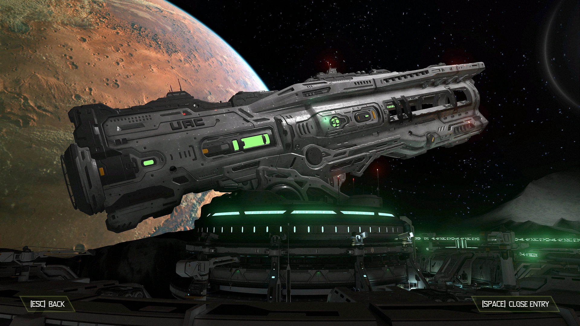 Originally established as a mining and communication relay, the UAC outpost on Phobos began immediate expansion following the destruction of the Argent facility on Mars. The UAC Board of Directors, intent on retaining their monopoly of the red planet and its surrounding airspace, issued the construction of an expansive defensive platform. Using technology derived from the BFG-9000, the design plan called for a massive particle cannon to be built on the orbiting moon. The BFG-10000, the largest man-made weapon platform ever conceived, wields enough firepower to defend against even the most sophisticated of capital-grade FTL cruisers in existence - or against the eventual potentiality of a space-bound demonic threat.