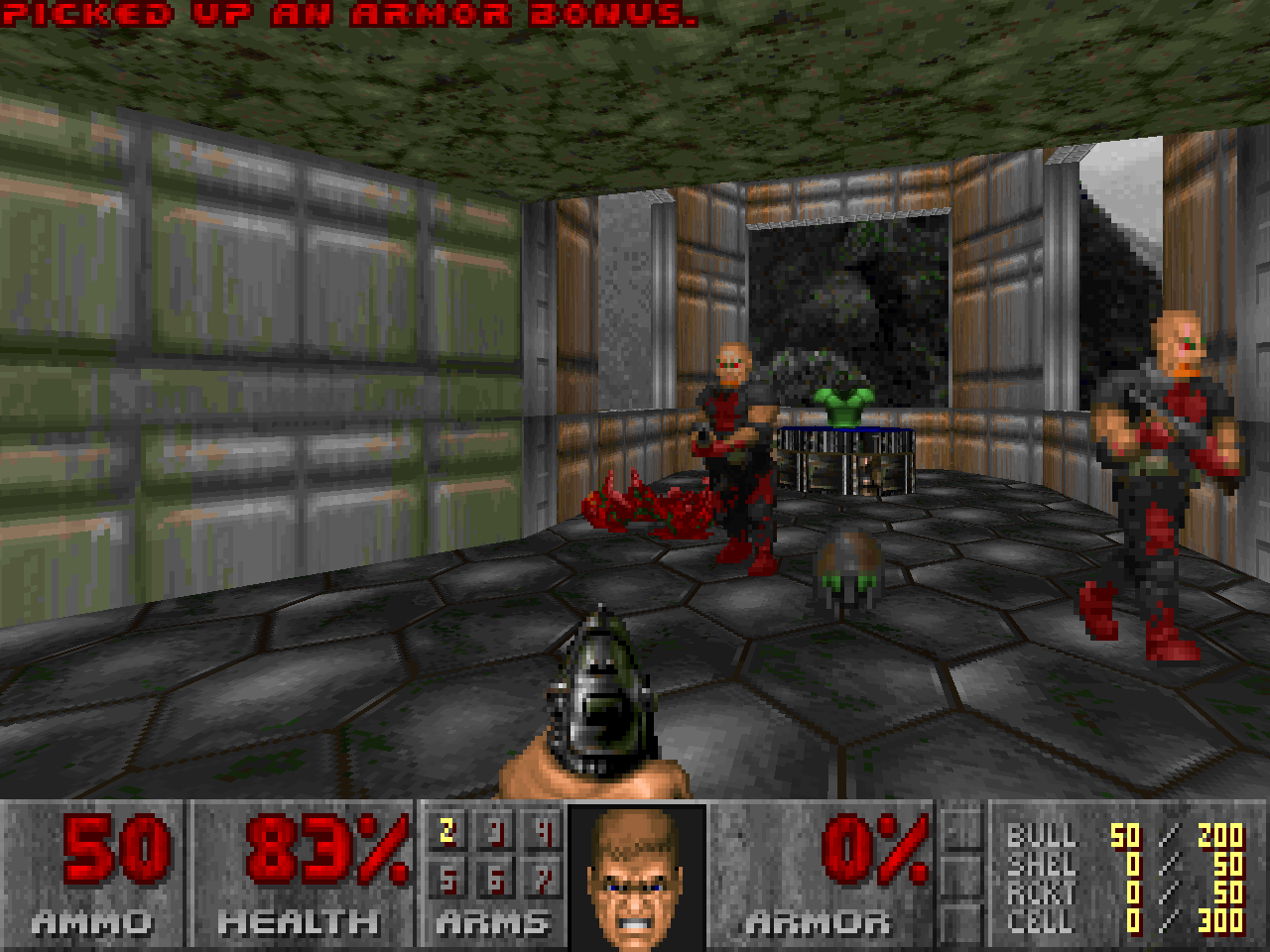 protagonist grins devilishly, and also grits his teeth intensely when firing a weapon continually. When taking damage, the marine similarly clenches his teeth in anger and pain, and otherwise his eyes are constantly and alertly darting to and fro. In these classic games, he has a 100% pain chance, meaning he freezes/cringes in pain when taking damage at any time. At the end of The Ultimate Doom there is a jocose tidbit about our hero, saying that the severed rabbit head