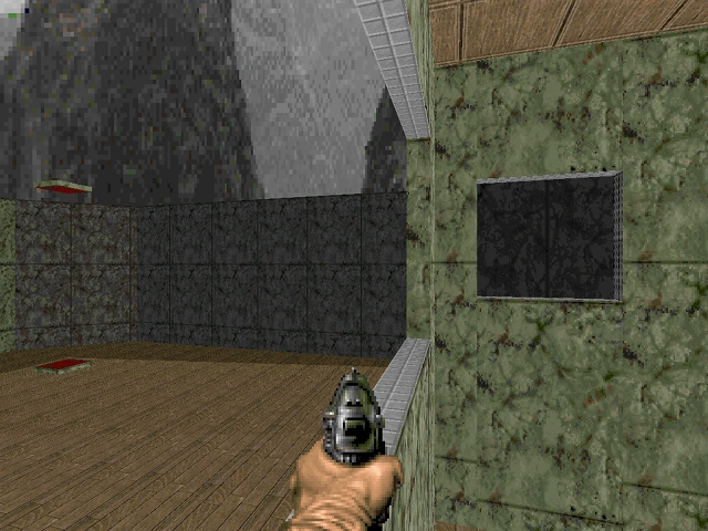 STEPS1.WAD is smaller than MINE1.WAD, and largely decorated in green marble. Several squarish rooms are connected by doors and a staircase, with a simple courtyard to the west containing a teleporter. The isolated wooden room in the north part of the map includes a nonfunctional switch; this was possibly intended to be the exit, as it would have been unlikely to be hit by accident in a deathmatch game.