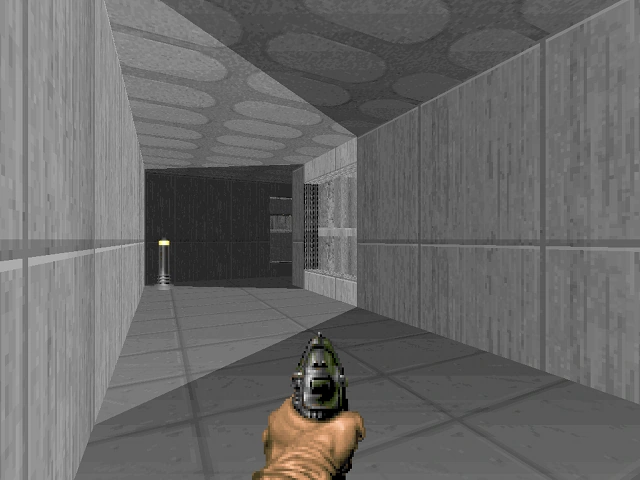 This level consists of several rectangular rooms joined by equally rectangular passages. Textures and lighting are fairly homogeneous, although there are a few early attempts to create shadow effects. None of the three lifts can be triggered from the upper end.