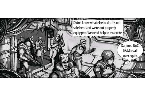 Upon arriving on the lunar base, the pilot and soldiers notice something wrong, briefly getting a glimpse of an Imp chasing someone in the distance. The three playable characters are quickly met by a UAC employee, Caldex, who informs the team about the invasion. The player remains behind to wait for the remaining marines, however they quickly perish when the elevator falls with them inside. Meeting radio static, the player ventures into Tychon Station to catch up with Caldex and the other two. Always one step behind, the player reaches Cichus Base then Kepler Site to catch up.