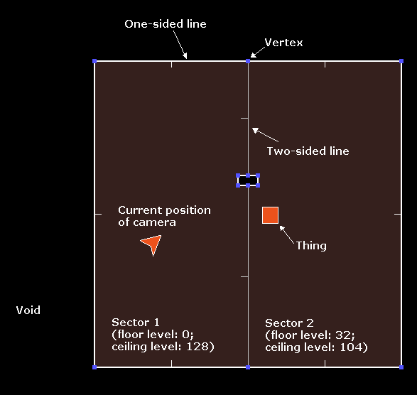 The base unit is the vertex, which signifies a single 2D point. In the diagram to the right, each small blue square is a vertex. Vertices (or "vertexes" as they are referred to internally) are then joined to form lines, known as linedefs. Each linedef can have either one or two sides, which are known as sidedefs. Sidedefs are then grouped together to form polygons; these are called sectors.