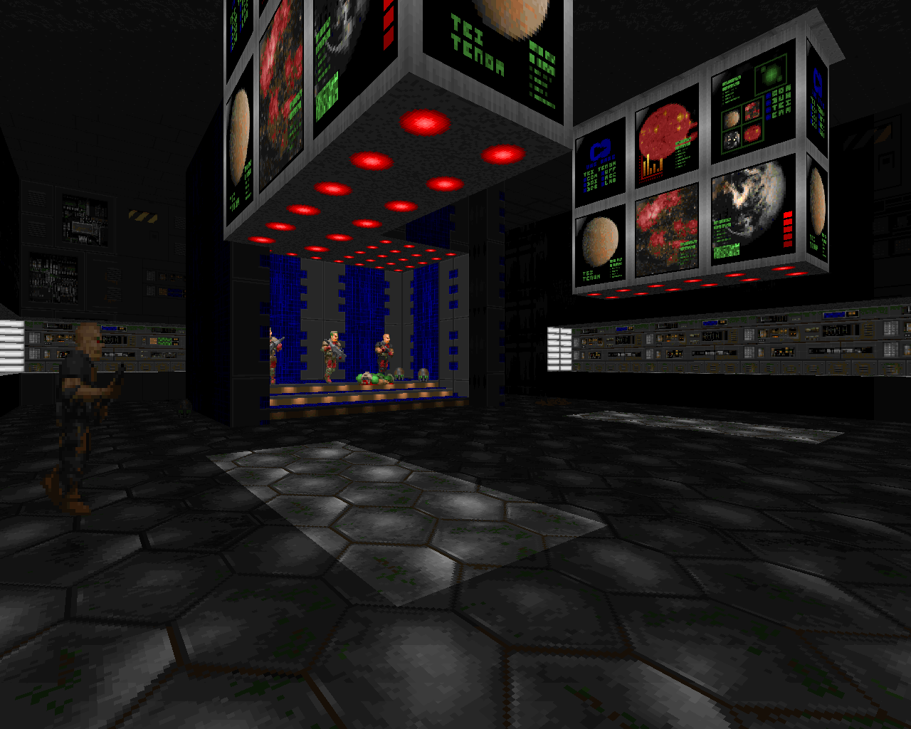 E1M1 showcased the new capabilities of the Doom engine, such as different height levels that can be reached with the help of stairs or lifts, windows through which you can see outdoor areas and the sky, non-orthogonal walls and environment hazards like the nukage pools.