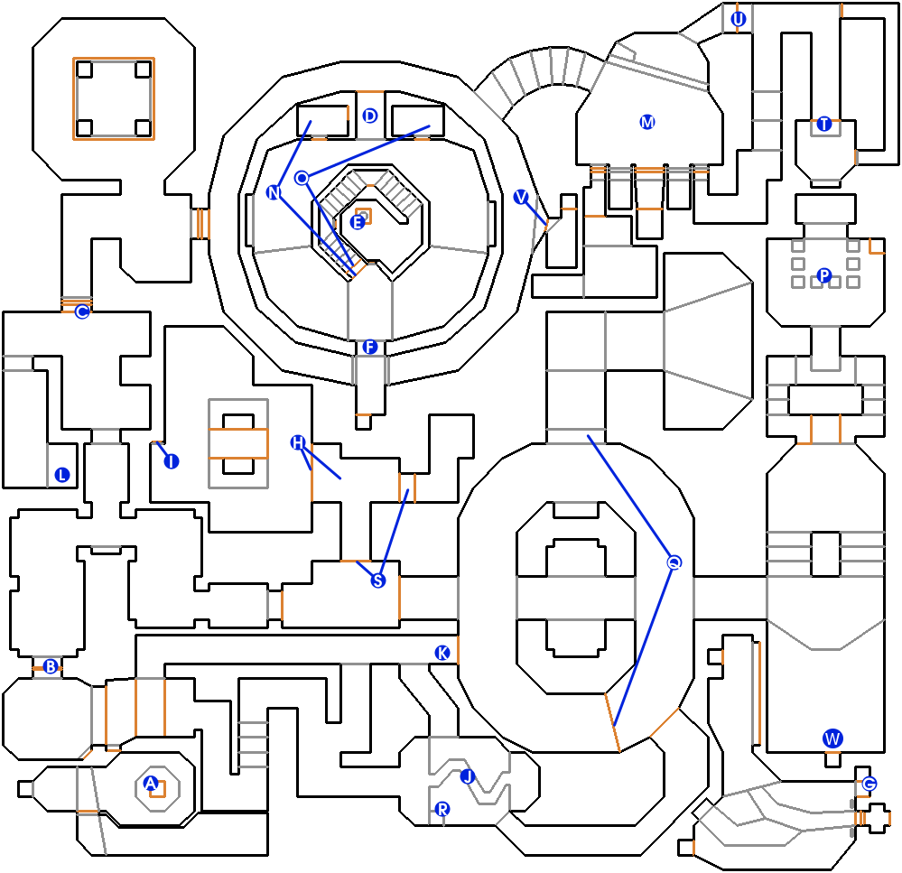 - Letters in italics refer to marked spots on the map. Sector numbers in boldface are secrets which count toward the end-of-level tally.