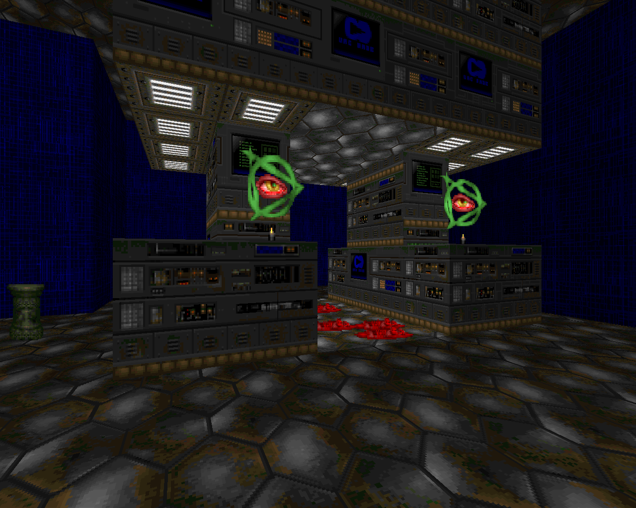 Sectors 173 and 177 have incorrect floor flats; the floors of these sectors use NUKAGE3 instead of BLOOD3. This results in very small patches of nukage which stand out in comparison to the blood pool surrounding them.