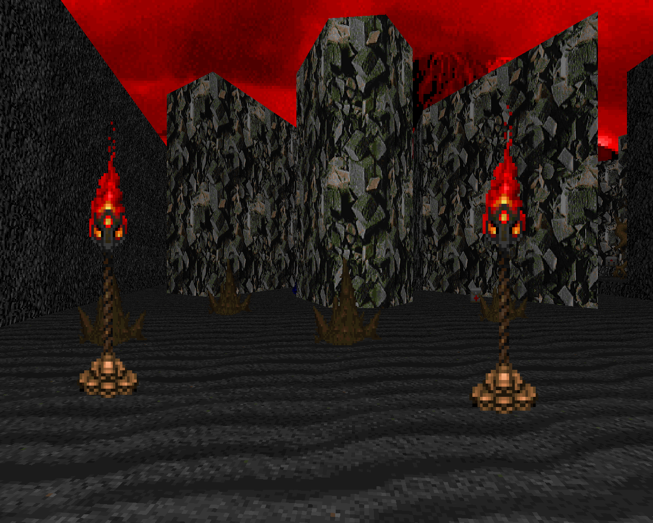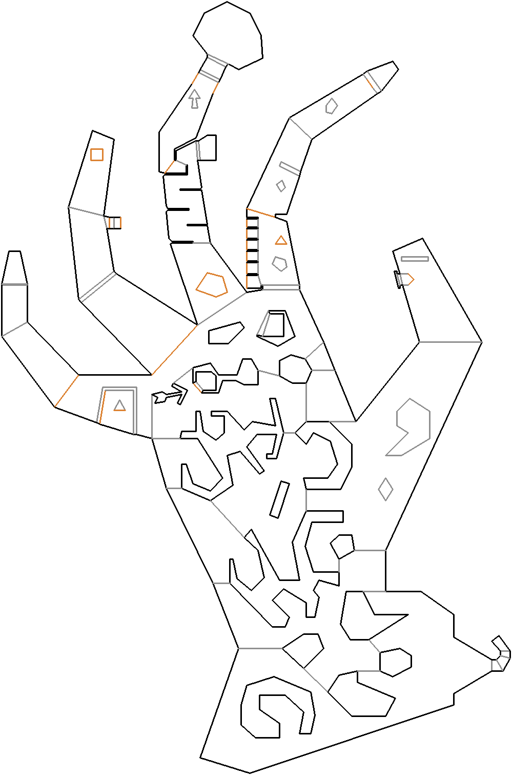 - The fiery grotto next to the "thumb" is an unclosed sector. Sector 22 is missing linedef 156, which is the sole linedef of sector 21. Interestingly, sectors 21 and 22 have differing ceiling and floor heights, creating a gap near the ceiling of the proper sector. This is not noticeable during normal gameplay as the grotto is too small to fit the player.