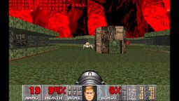 An effective strategy for this level is to deliberately cause the other monsters present on the level to attack the Spiderdemon. The Spiderdemon will then become preoccupied infighting with the other monsters and will ignore the player's fire until the attacking monsters are killed. For example, you can move behind a Cacodemon, and the Spiderdemon will try to fire at you, but will fight the Cacodemon instead. Fire at the Spiderdemon from behind the Cacodemon, but do not fire at the Cacodemon itself. Eventually, the Spiderdemon will kill the Cacodemon, but the combined forces against the boss will cause it to die faster (see demo below). This method is a good way to distract the Spiderdemon in battle so you can collect the ammo that is sitting the outer ledge. As a consequence of the extra ammo and monster respawning of Nightmare skill, this is one of the few levels that is generally easier in Nightmare mode than on Ultra-Violence.