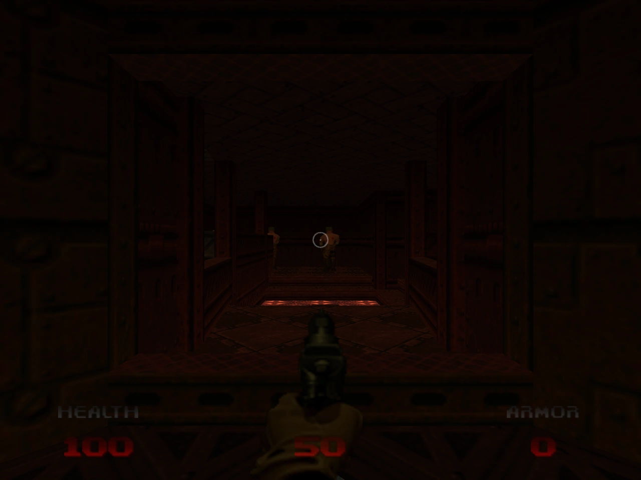 After cleaning the starting area, enter a smaller door in the right niche. The following room is pitch black, with the exception of red symbols on the floor. Interpreting the triangles as arrow heads and diamonds as junctions, they lead your way into the darkness. The way to the right is locked. Careful to the left: A lift takes you down to a cell block where several demons get released after you passed the hallway. But there are several boxes of bullets for a chaingun and medikits.