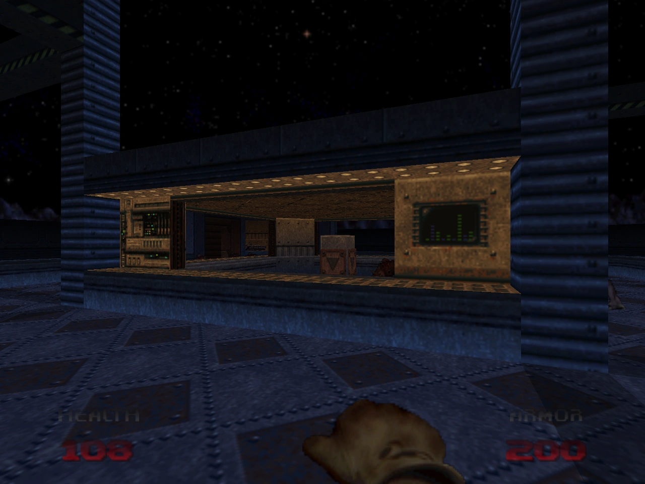- In the 4 switches room, press the orange computer screen behind a Barrel to open two niches containing Rockets, a Supercharge and some Lost souls.