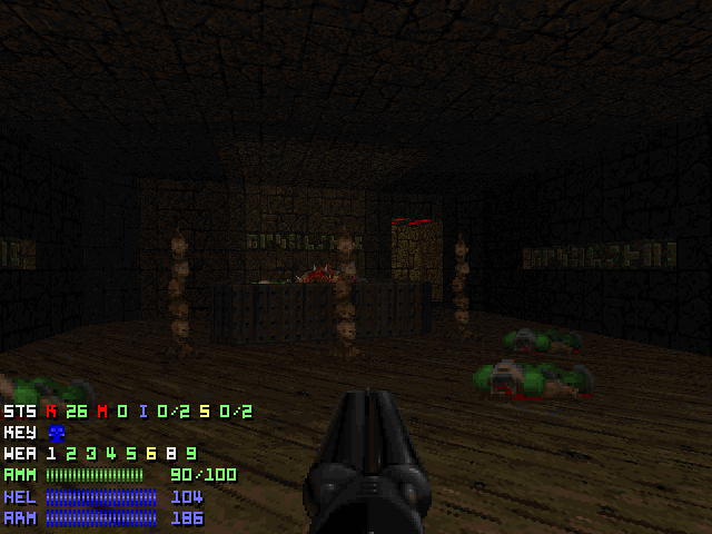 - At the start of the map you will find 4 fire torches behind bars, one of them is a blue fire torch, go to it and press your use/open key (Spacebar by default) and a wall will open back at the start point of the map with a monster in it, once in the hole that opened you will be outside where two platforms will lower, containing a Chaingun, Berserk pack and a soul sphere.