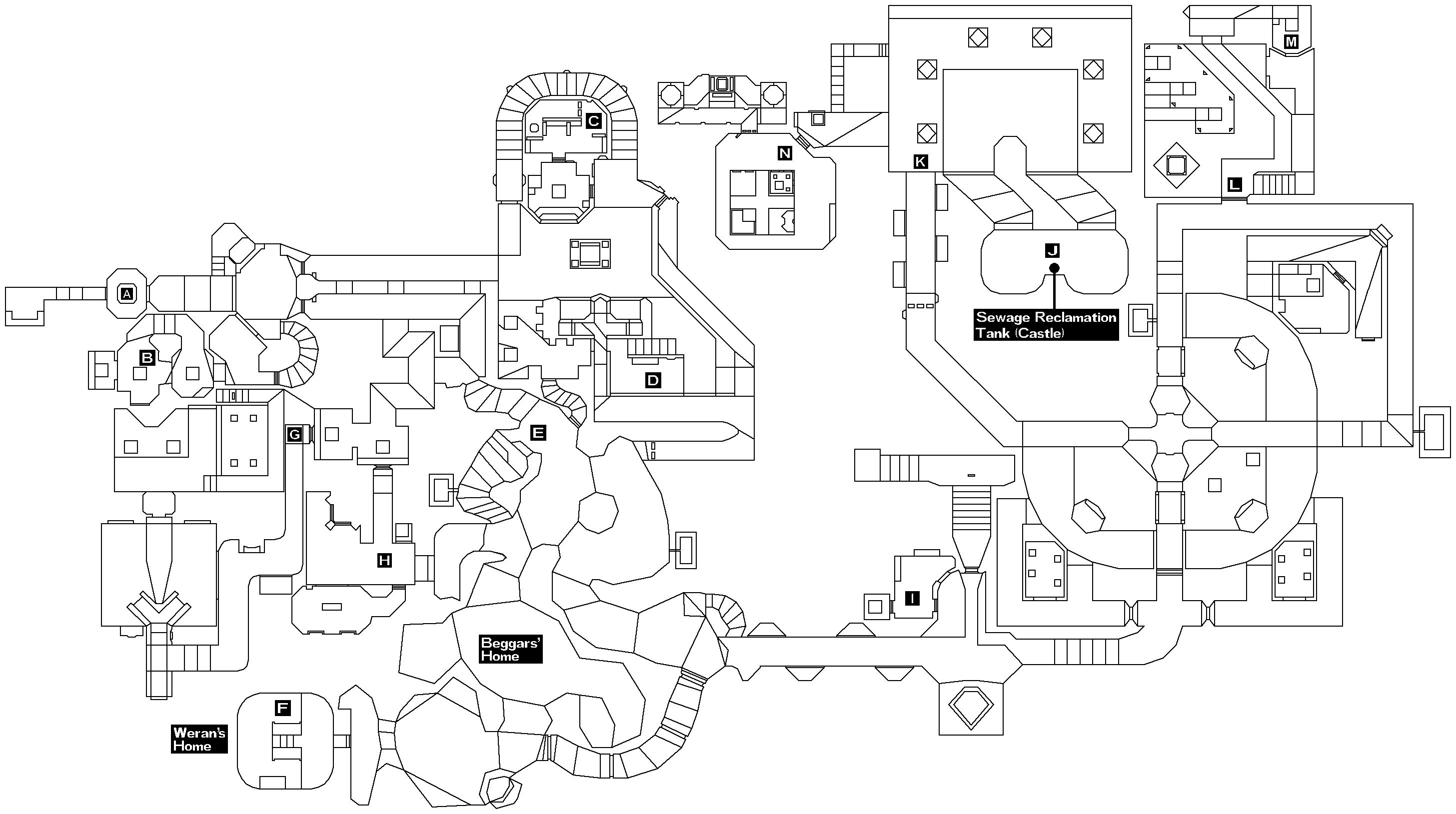 You start this part in the Sewage Reclamation Tank (J). Head north through either opening, then south through the other southern exit from this room (K). Follow the corridor around to a door (L) (shortly before the door is a supply stash if you're short of anything); open it and follow the walkway to a valve. Turn this then retrace your steps to (K). Turn left and cross to the door, then enter (N). Press the button, and jump up into the passage; follow it around to a switch, press this to reveal the Gate Mechanism, stand back and destroy it with your weapon of choice. (One HE grenade round should do it.) Then cross the place where it was and go down the corridor (K) again (the first part is now another sentinel gauntlet; the end of which is blocked by bars, but fortunately there's an obvious switch) until you get back to (I); use the teleporter to (H), then exit to Town as above.