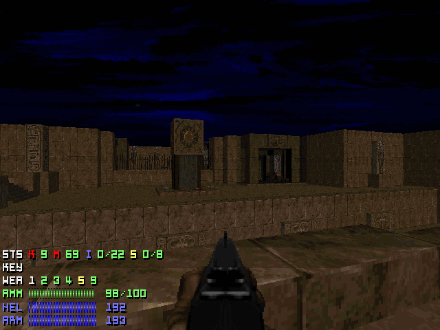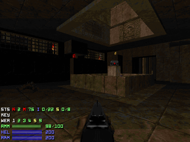 - Continuing from (3. to 6.), standing in the red door room, facing the back wall, a section of the left wall (right behind the second candle, counting from the entrance) can be opened to reveal another secret (Reward: BFG 9000)