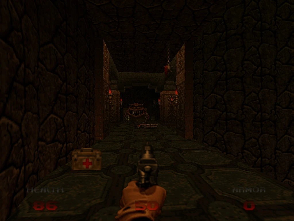 MAP21: Pitfalls is the twenty-first level of Doom 64. An infernal frontier of subterranean proportions that teeters on the verge of total darkness, it is accompanied by an unearthly ambience characterized by deep howling, shrill strings, and buzzing insects. The first part of the level is suggested in the name, as there is a perilous cavern with a huge pit of lava in the middle. The player has to find their way over the pitfalls while battling imps and cacodemons. It uses the music track "Perfect Hate" by Aubrey Hodges.