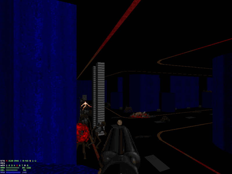 - In the large T-shaped blueish room protruding from the walls press the western-most of them. It will lower giving you access to the balcony and the corridor behind it. Find a Computer map, a Blur artifact, a Combat armor and a Soul sphere there.