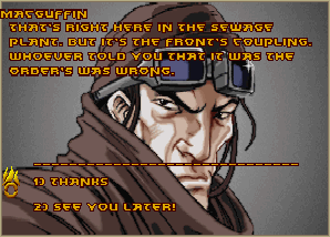 MacGuffin is a minor character from Strife. He is a fairly old man who is found near the "Sewage Plant" in an area referred to as the "Bum Hole" by Blackbird. The only time he appears useful in the story is during Governor Mourel's "messy" chore, where he can help the player complete the chore.