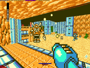 The game is divided into 13 separate chapters, each spanning one Mega Man game with locales made to look like levels from their respective games. (Cut Man's level, Heat Man's level, and so on.) As well as the deathmatch levels (and team deathmatch in the case of chapter 9), at the end of each chapter lies a boss fight. In most cases, you won't be fighting a stock bot. Boss battles take a bit more time and skill. The bots are quite adept at using the boss weaponry and know exactly how each one works (with some exceptions). Unfortunately, due to the Skulltag bot code being lost, the robots are still dumb as a post in some situations. Sure, they can fight and more than likely do you some serious harm, but can they intentionally jump off tall cliffs? Or navigate areas with pits? Can they climb ladders? Can they even capture the flag if it's right in front of them? Not generally, no... This is why, for most people, the real draw of the game is in...