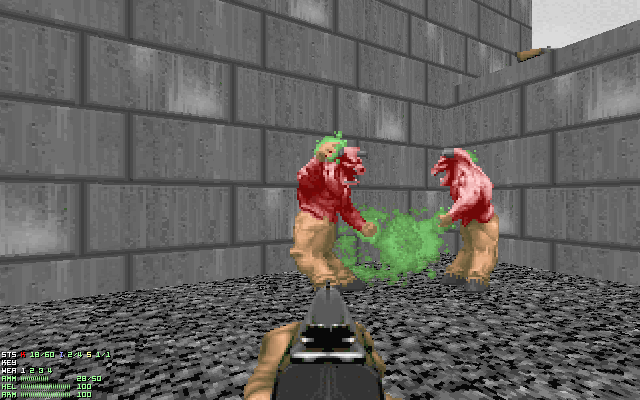 Even when the player encounters a large number of mixed monsters, running in circle several times will likely initiate an infight due to stray projectiles being hurled in multiple directions. MAP16: Suburbs and MAP18: The Courtyard, which feature a diverse cast of enemies as well as a large open area where the player can freely move around, can make this an effective strategy.