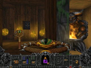 The Serpent Staff is a weapon from Hexen, the second of four weapons available to the Cleric. It resembles a short, snakeskin-bound staff with a large reptilian eye set into the headpiece. The eye blinks every so often when the weapon is not being fired. The neck of the weapon has the trident of Neptune on it, the symbol of the Serpent Riders.