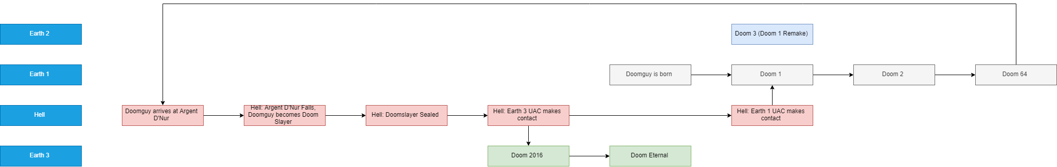 I would also like to add to this conversation, if that's ok. The Soul Cube being shown in Doom Eternal is just an easter egg, nothing more. While Id themselves haven't outright said "yeah, Doom 3 isn't canon to the rest of the francise", there is enough in-game hints from both 2016 and Eternal, plus codex entries, etc those flashback cutscenes proving that the Doom Slayer is Doomguy. The Doom Marine from Doom 3 has nothing to do with the rest of the francise. There's quite a few pages on this wiki that haven't been updated in ages, before Doom Eternal was released, that have speculation on who the Doom Slayer is. A page talking about alternate timelines, etc. Those pages are outdated and aren't factually correct anymore. Plus, the Quake Champions stuff isn't canon, either. Zero mention of it is in Eternal. It's just a cosmetic thing. I feel like some of those old pages need to be deleted, or updated. The included image here of this timeline chart is basically canon. Doom 3 never has been, and probally never will be canon to the rest of the games. (While the image does forget Final Doom, just pretend it's in there before Doom 64). While canon can always change (the next Doom game could add or remove so many elements from the story of Eternal, who knows), i firmly believe a consensus should be reached on this page. Doomguy=Doom Slayer, Doom 3 is not canon, and Quake stuff is also not canon/indicative of anything. And something needs to be done about outdated lore pages. This is the timeline image i was talking about. ExodusBF4 (talk) 10:34, 10 May 2021 (UTC)[1]